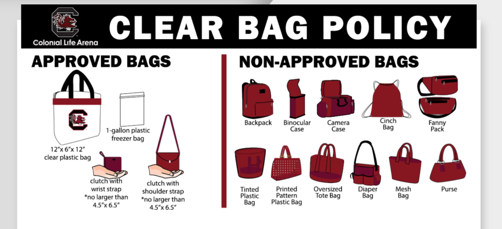 The Colonial Life Arena has a Clear Bag Policy and requests that guests arrive early and travel light, as all guests and bags entering the Colonial Life Arena are subject to search. For more information on the Clear Bag Policy attached and click on the link: https://www.coloniallifearena.com/plan-your-visit/clear-bag